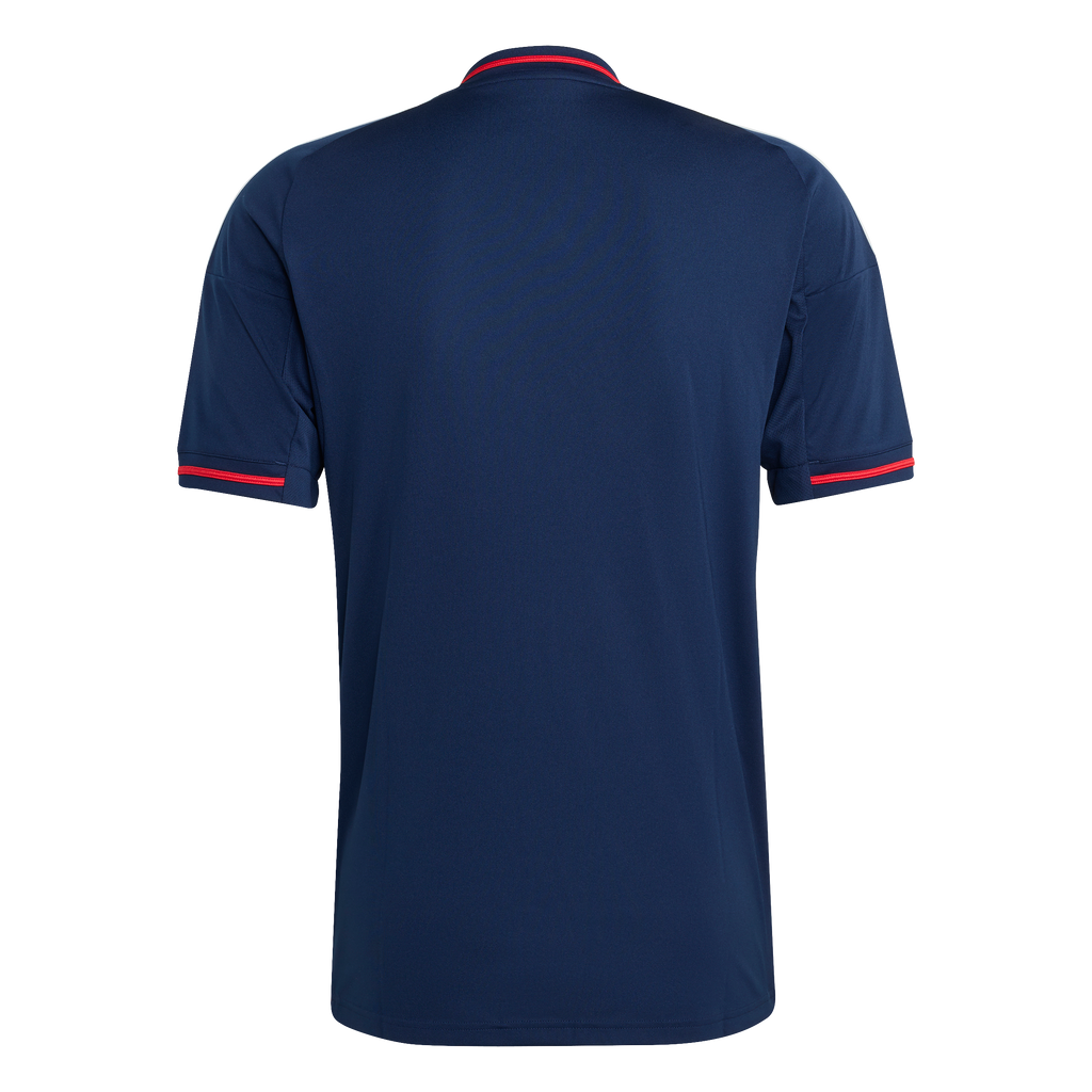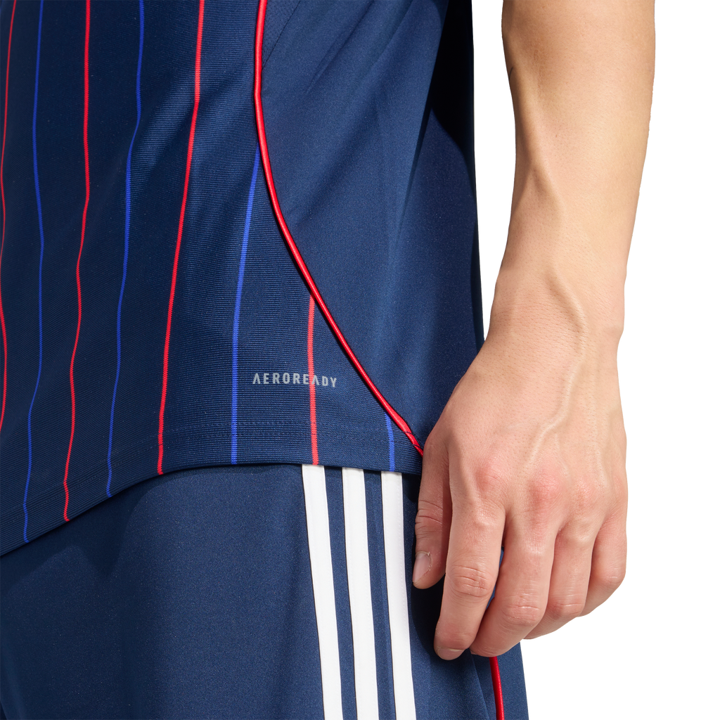 Take pride in your football colours. Borrowing from some of the club's most popular away kits, this adidas Olympique Lyonnais jersey fields red and blue pinstripes over a navy base. Behind the eye-catching design, AEROREADY controls moisture to keep fans and players comfortable. A woven club badge and "Fiers de nos couleurs" sign-off add L'OL pride to the timeless look.