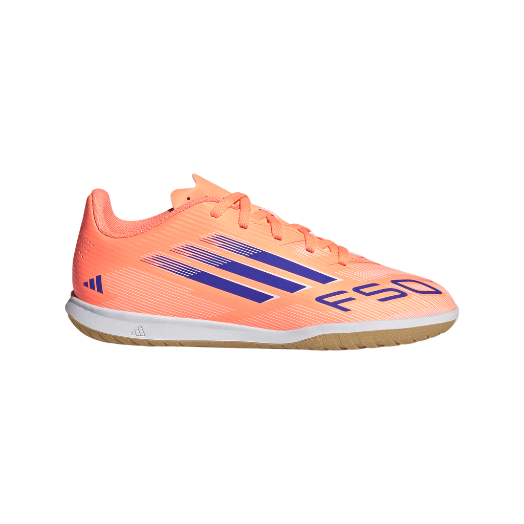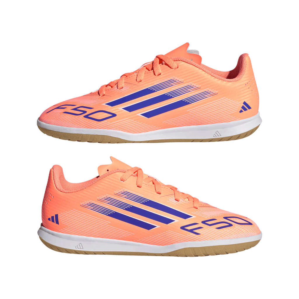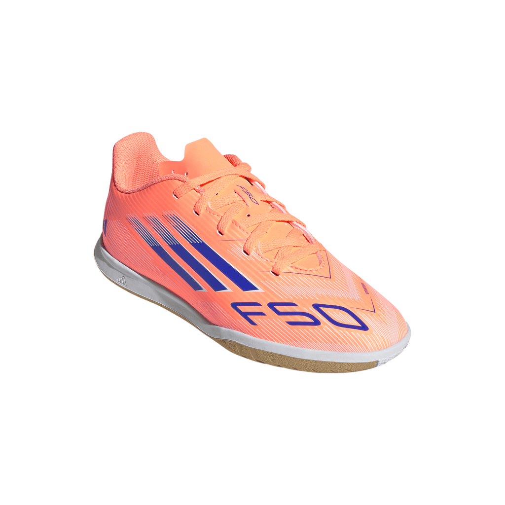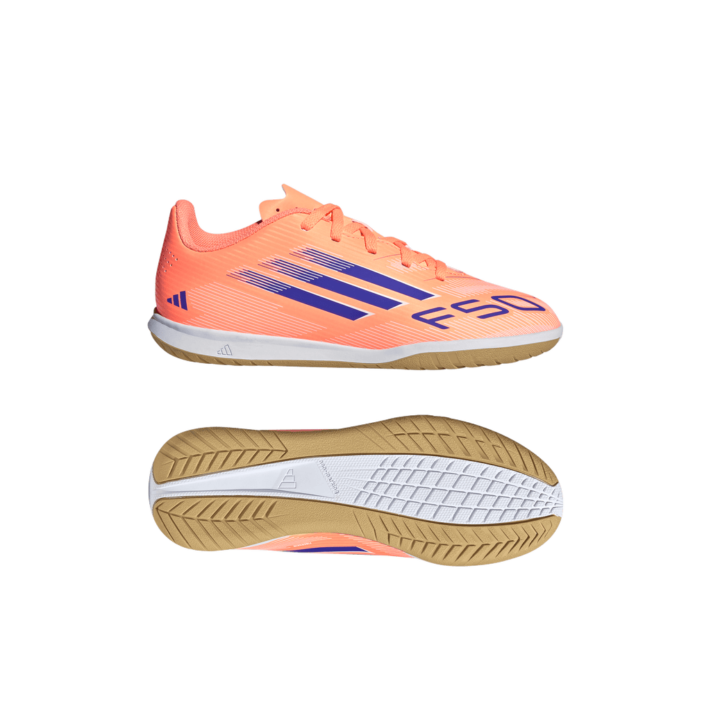 Find your fast to truly express yourself on the court. Feel the rush in adidas F50 cleats engineered for speed. These juniors' Club soccer cleats keep you comfortable on the move with a lightweight synthetic upper and perforated tongue. Turn them over and you'll find a grippy rubber outsole that supports speedy play on flat indoor surfaces.