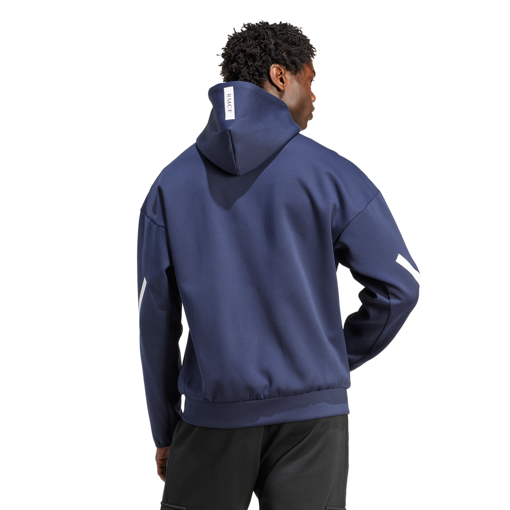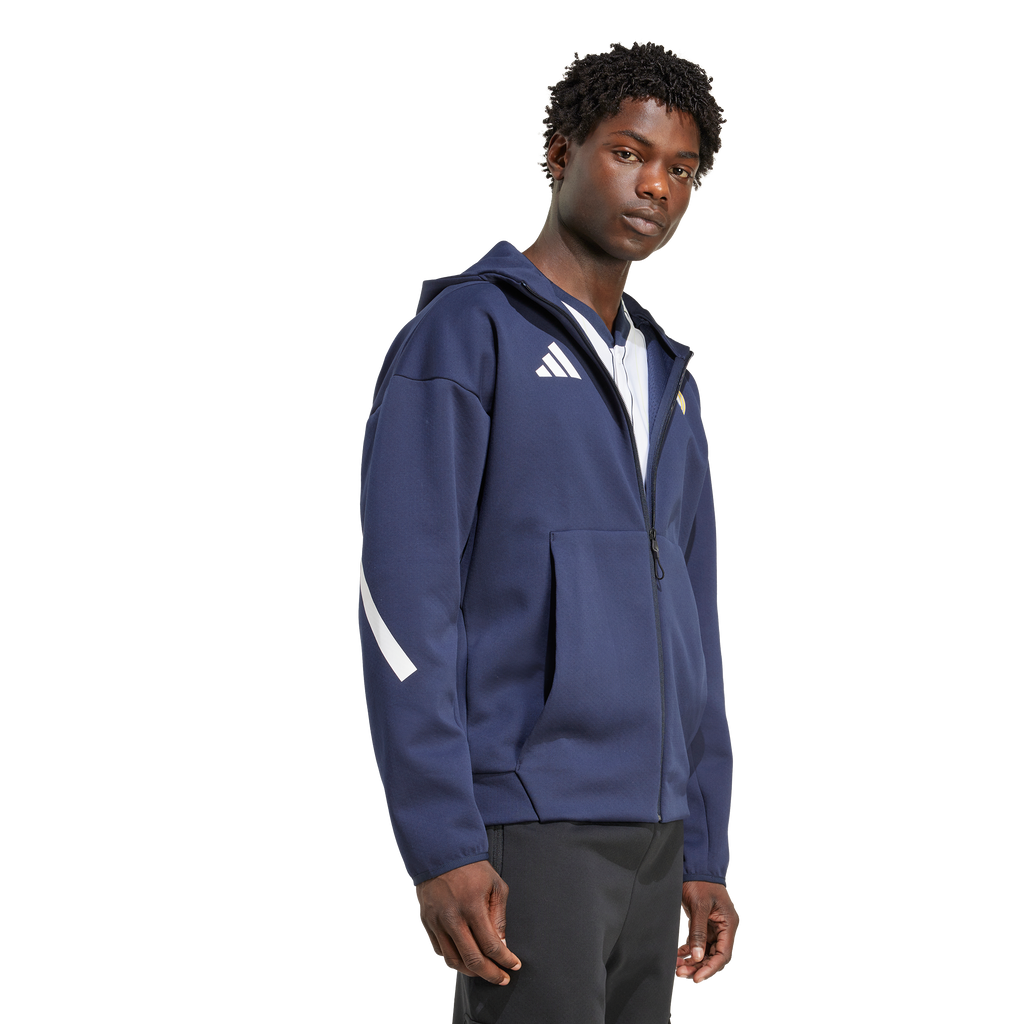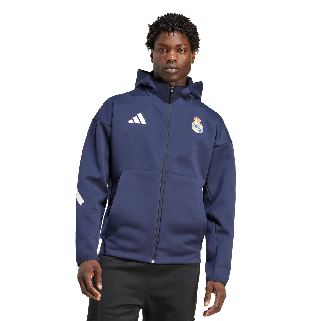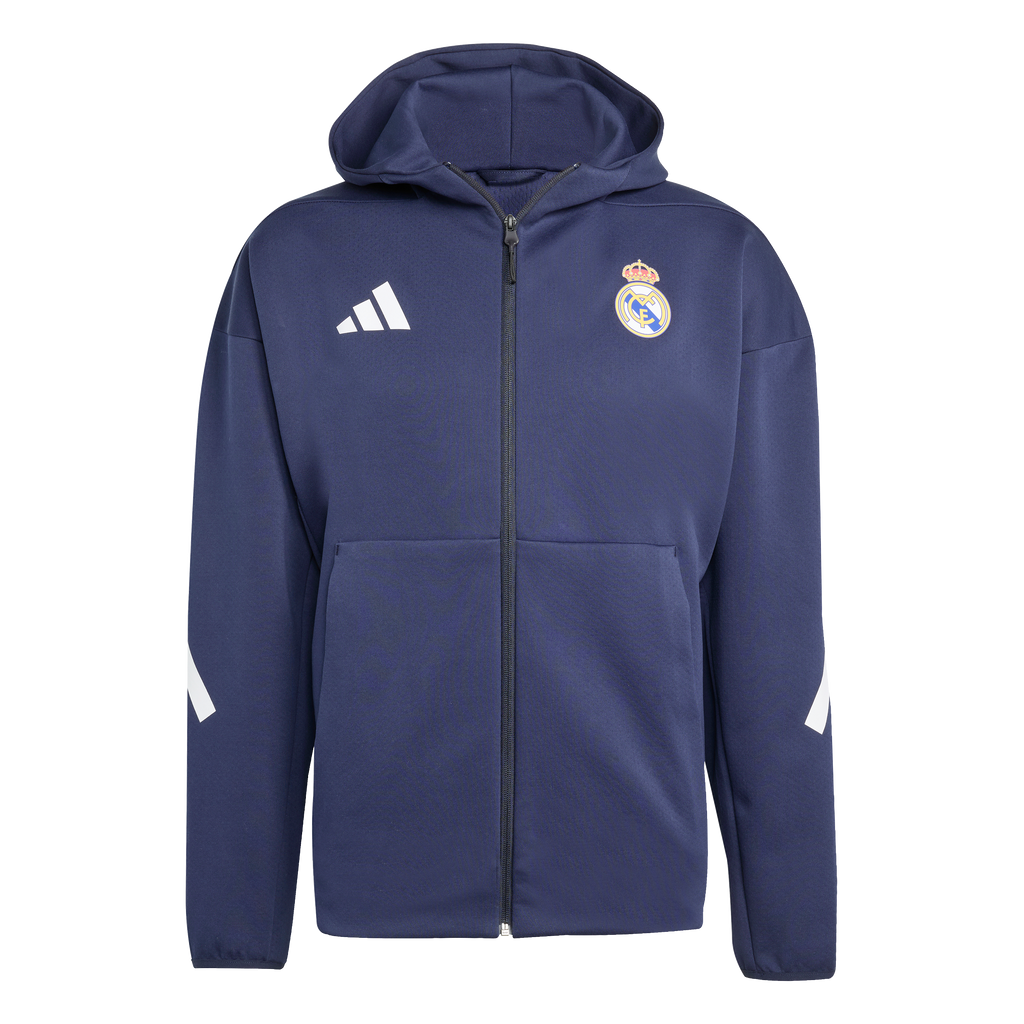 Created to keep you focused, this Real Madrid jacket is from the ADIDAS Z.N.E. family. The football hoodie the players wear as they walk onto the field, it's built from soft doubleknit fabric to help tune out distractions. On top of the spacious hood, a club graphic completes a look that will make all Madridistas proud.