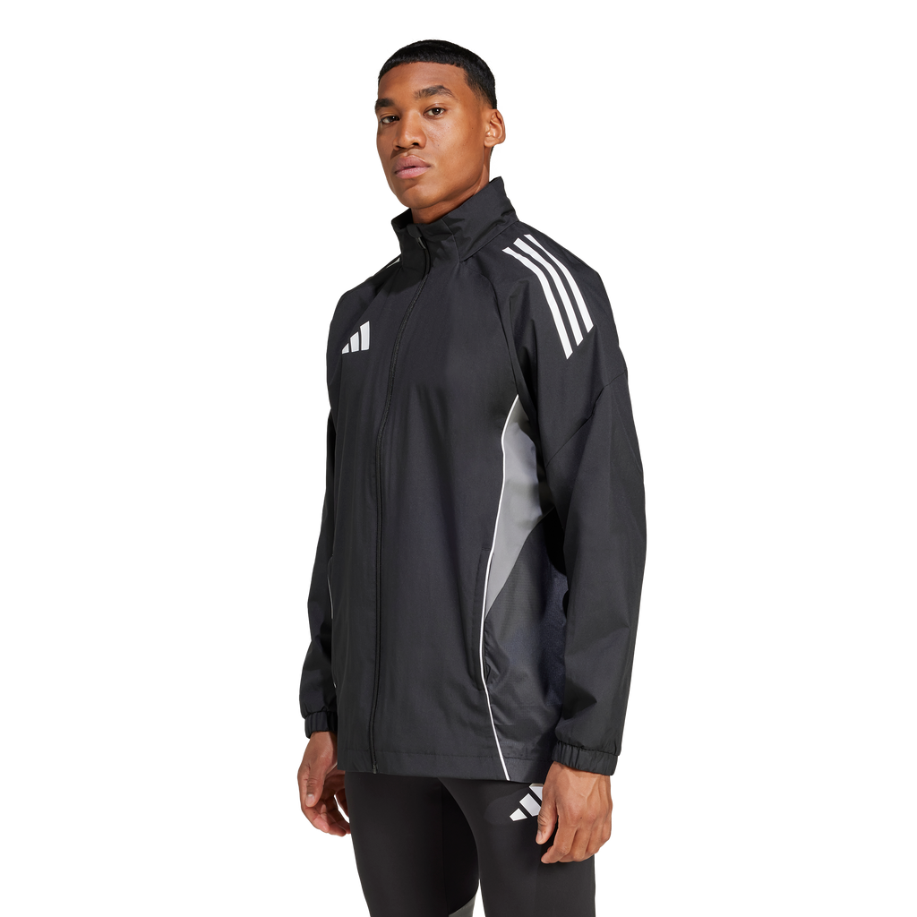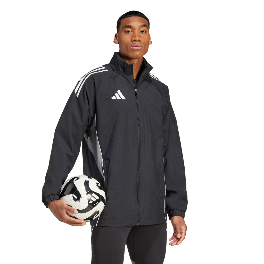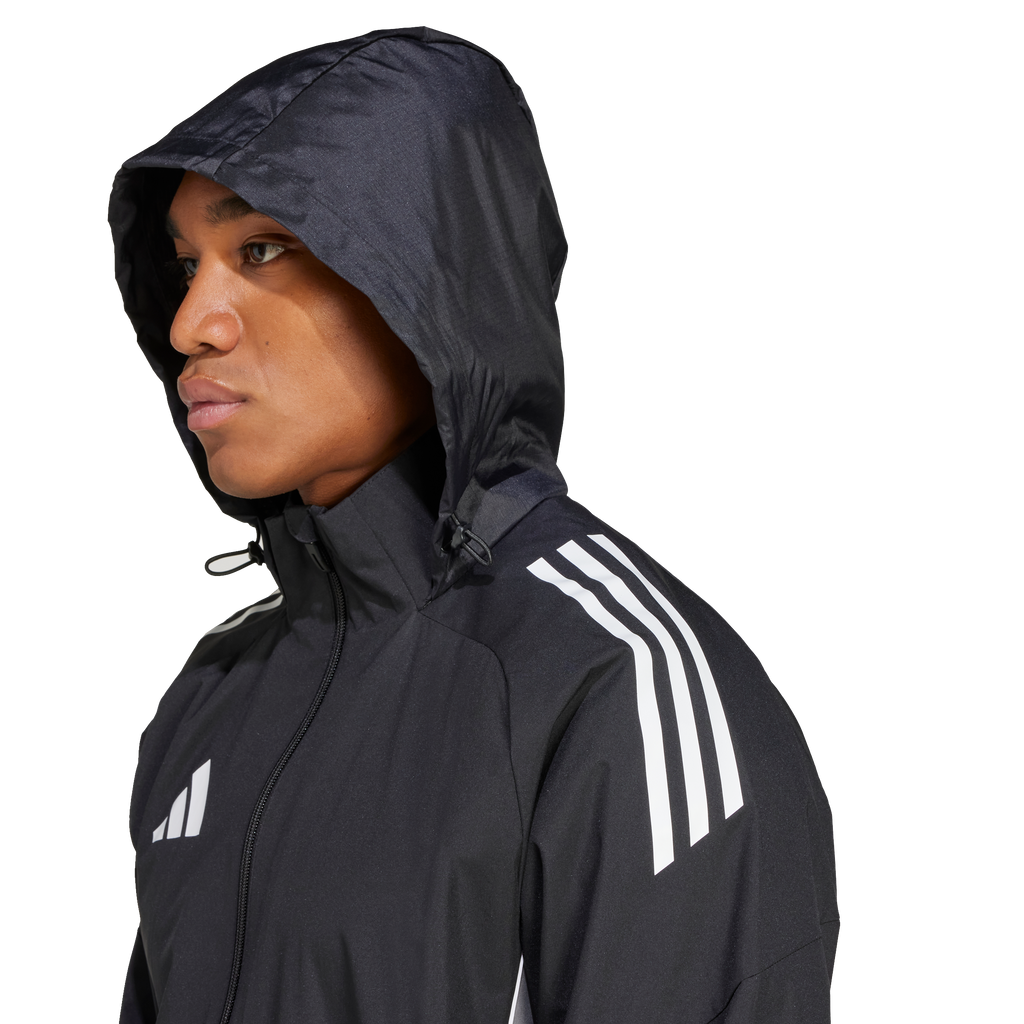 Be ready for everything Mother Nature can throw at you in this adidas Tiro 25 Competition jacket. Designed to help you power through the elements, its soft plain weave fabric has your back until the coach calls time on football training. That hood keeps you dry during light showers but packs away when you need a more streamlined silhouette.